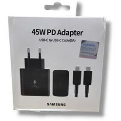 شارژر اورجینال 45W سامسونگ از یک آداپتور 45 وات و یک کابل تبدیل دو سر تایپ سی تشکیل شده است. این شارژر دیواری دارای نسخههای متفاوتی با توجه به پارت نامبر یا همان سفارش کشورهای مصرف کننده میباشد به همین علت این شارژر در بعضی مدلها به صورت دوشاخه طراحی شده و در بعضی دیگر سه شاخه که نیاز به مبدل دوشاخه است تا بتوانید آن را به پریز برق متصل نمایید.
