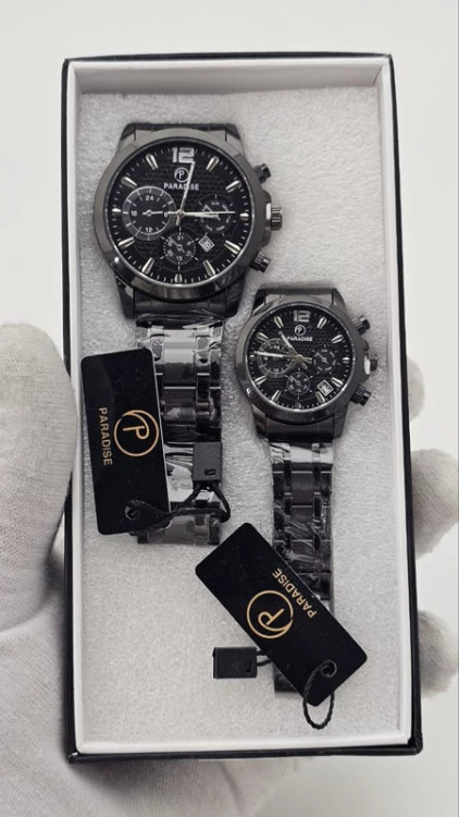 فقط به صورت ست قابل سفارش هست بک استیل داره و نام برند روش حک شده همینطور روی قفلش حک برند داره نوع قفلش کلیپسی هستی کار فوقالعاده شیک و طرح سه موتوره هستش مناسب هدیه دادن جعبه خود کار فوقاالعاده شیک هست برند شرکتی ابکاری قوی ضد اب در حد شست و شوی دست قابلیت تنظیم بند و تعویض باطری و تعمیر موتور به هر نوع مچی اندازه میشه طول مناسبی داره