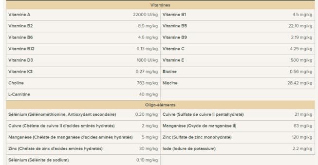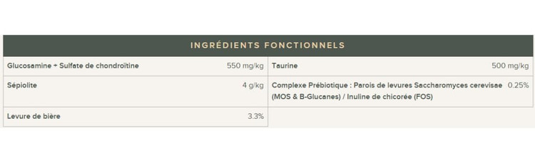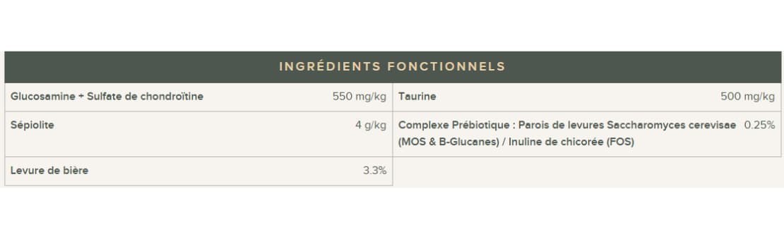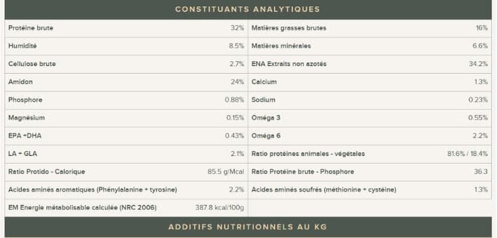 پروتئین طیور کم آب 30 درصد (مرغ)، ذرت، گندم، چربی اردک، تفاله چغندر، مخمر آبجو، کلرید سدیم، گلوکزامین (منشا دریایی)، کندرویتین سولفات، کویلاجا ساپوناریا، پروتئین خام: 27٪، چربی خام: 11٪، خاکستر خام: 7.3٪، فیبر خام: 1.77٪، رطوبت: 9٪