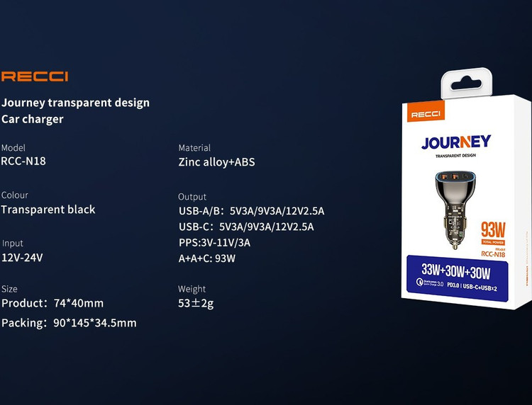 شارژر فندکی Recci فست شارژ تایپ سی 93 وات مدل RCC-N18، یک انتخاب عالی برای افرادی است که در استفاده روزمره از دستگاههای الکترونیکی به شارژ سریع نیاز دارند. این شارژر فندکی، یک دستگاه قابل حمل و کارآمد برای استفاده در خودروها به حساب میآید. این شارژر فندکی، دارای طراحی شفاف است و امکان شارژ سریع و ایمن دستگاههای الکترونیکی را برای شما فراهم میکند.